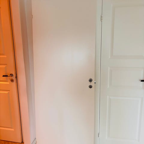 Innerdörr till badrum med handtag och lås. Dekorativa runda dimmade fönster.