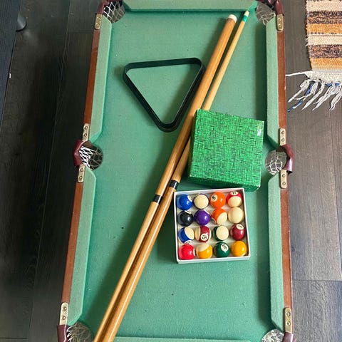 Biljardbord för hobbybruk inklusive köer och kratta.
