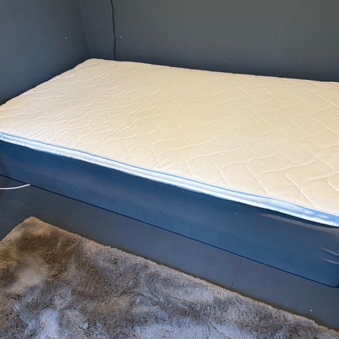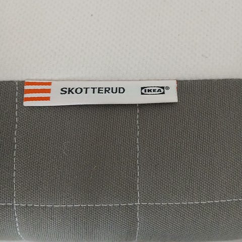 IKEA Skotterud resårsäng med medium fasthet. Sängen har en klädd ram med ben i trä och en madrass med resårfjädrar som ger stöd och komfort.