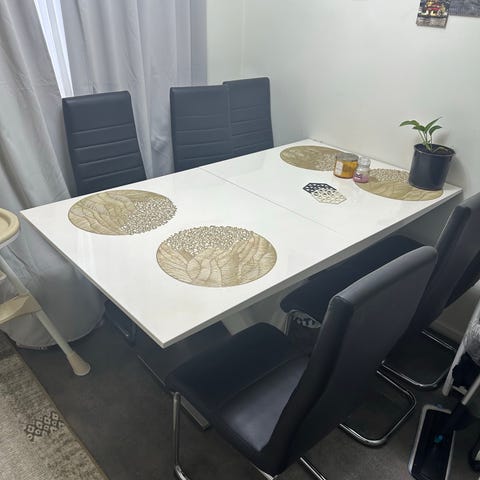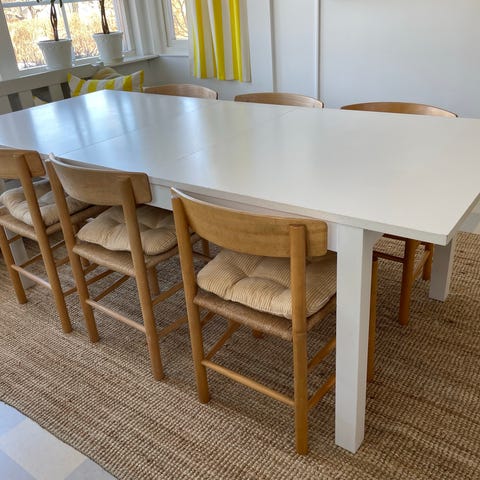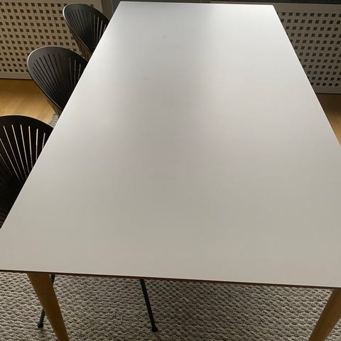 Masivt ekbord med vit laminatskiva. Ingår 2 illägsskivor 50cm bred var.