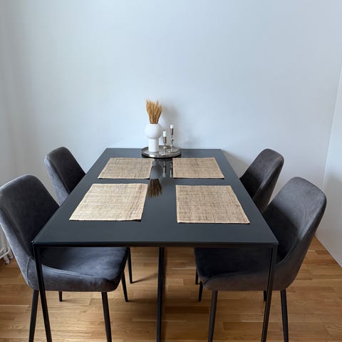 Hej, säljer vårt matbord och 4 stolar i fint skick. Finns någon enstaka repa/märke på bordet men syns knappt (se bild). Stolarna är svarta och bordets skiva är i ljusare trä färg.