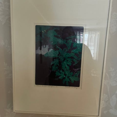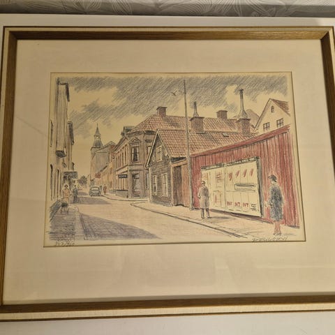En samling av sex svartvita teckningar med Norrköpingsmotiv av Birger Strååt Teckningarna är inramade och visar olika vyer av byggnader, vatten och natur. Varje teckning har en enkel ram i trä eller metall.