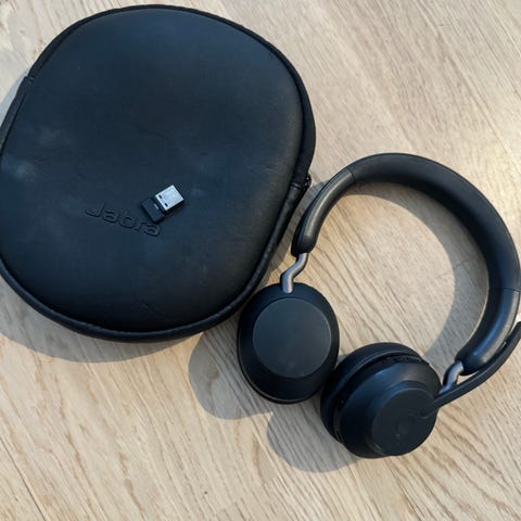 Helt oanvända Jabra Evolve 40 MS Stereo hörlurar med ljudkontroll och mikrofon, inklusive fodral för förvaring. Designade för att användas med olika enheter och erbjuder justerbar volym och samtalsstyrning.