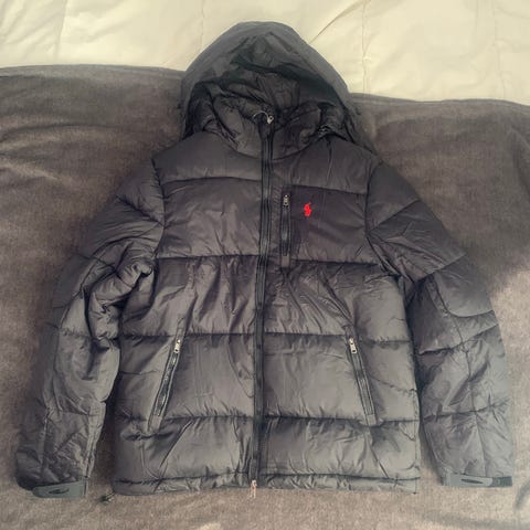 Ralph Lauren Jacka i storlek M för män. Jackan är svart och tillverkad av polyester. Den har en vadderad design med huva och dragkedja framtill. Passar för utomhusbruk.