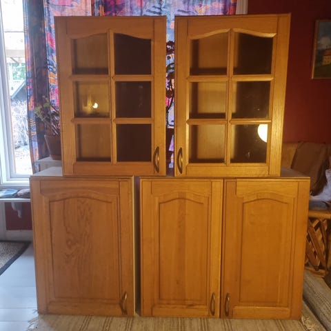 Vitrin/köksskåp från IKEA i Ek med Eksidor o massiv ekskiva. Glas hyllplan samt glas i skåpen samt dörrar med frostade rutor.