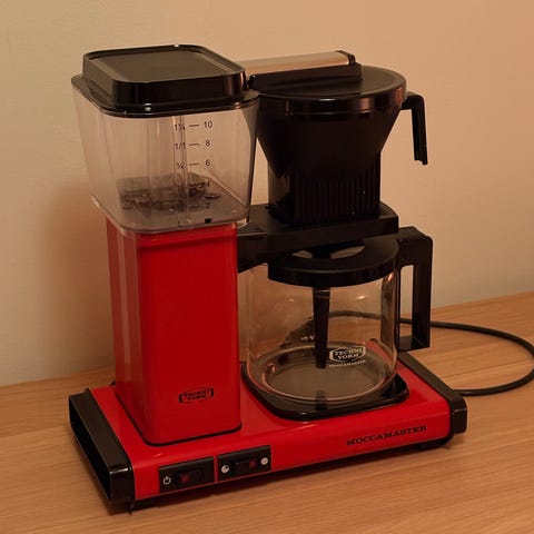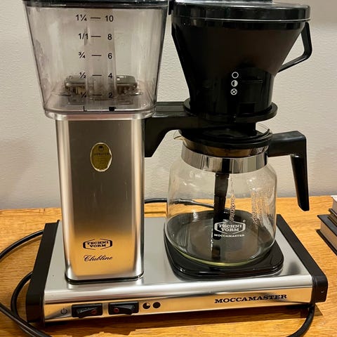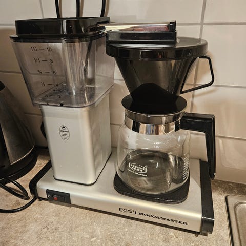 Moccamaster kaffebryggare i svart färg. Utrustad med en glaskanna och ett vattenfilter. En liten spricka i vattenbehållaren högst upp inget som påverkar.