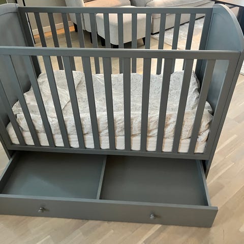 Bra spjälsäng med 3 olika höjdnivåer. Priset inkluderar en fräsch DreamZone madrass. En spricka i ena gaveln finns (se bild), påverkar inte funktionen.