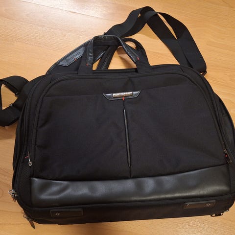 Samsonite tygväska för unisex med flera fack och bärrem. Väskan har ett handtag och är utformad för att bära dator och andra tillbehör. Färgen är mörk och materialet är tyg.