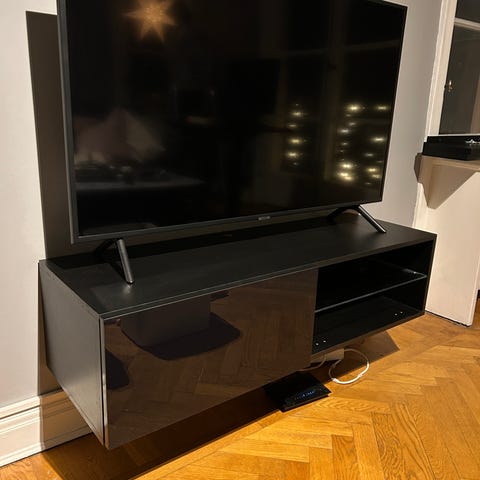 En grå tv-bänk / mediamöbler i använt men gott skick. Någon enstaka repa och märke men inget som stör.