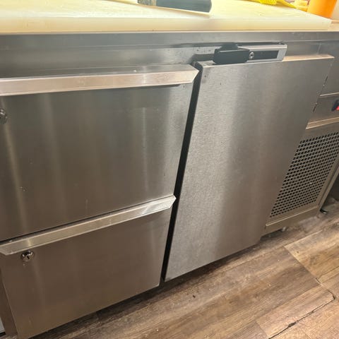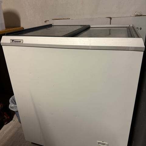 Kylskåp med glasdörr och inbyggd belysning. Utrustad med flera hyllplan i metall för förvaring av drycker eller andra kylvaror. Passar för kommersiellt bruk eller hemmabruk där synlighet av innehållet önskas.