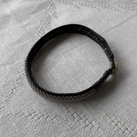 Handgjort armband i svart skinn med tenntrådsbroderi, knapp av renhorn, ögla av skinn och sentråd. Längd 18,5 cm, bredd 10 mm.