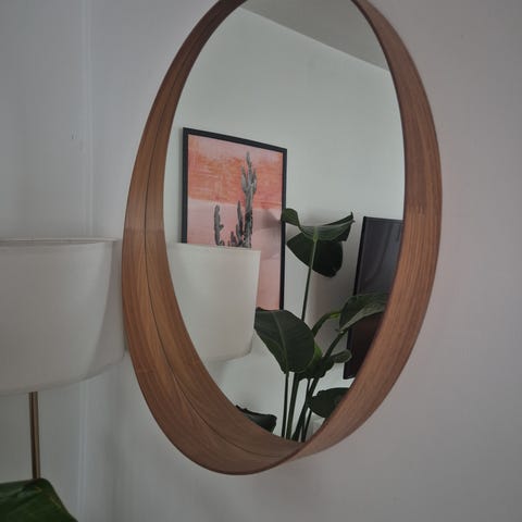 IKEA spegel, 60cm i diameter. Spegeln har en cirkulär form och en ram som är gjord av trä.