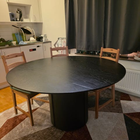 Mio matbord runt i trä med en mörk ytfinish. Valnötsfärg. Passar för olika matrumsmiljöer och kan användas som ett centralt bord för måltider och samlingar. En extra stol ifall man får större sällskap ryms även runt bordet (totalt 5st)