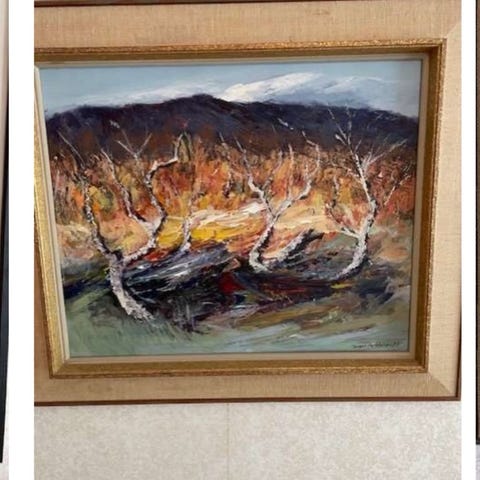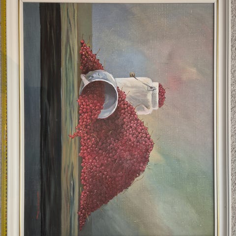 Oljemålning föreställande en sädeskärve i jordnära färger. Målningen är inramad med en guldram och visar detaljerad textur i motivet.