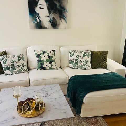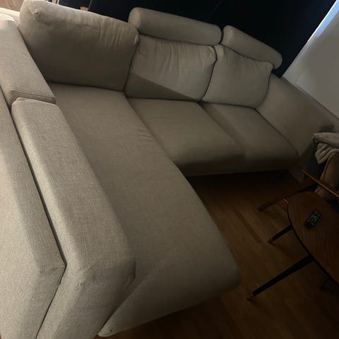 Grå tresitsig L-soffa med tillhörande 5st soffkuddar om önskat.