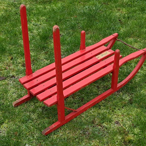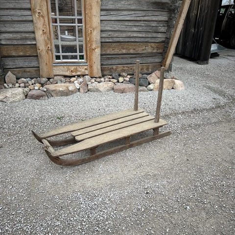 Träkläke med ratt och broms. Kälken är tillverkad av trä och har en ratt för styrning samt en broms för kontroll. Passar för användning i snö och vinterlek.