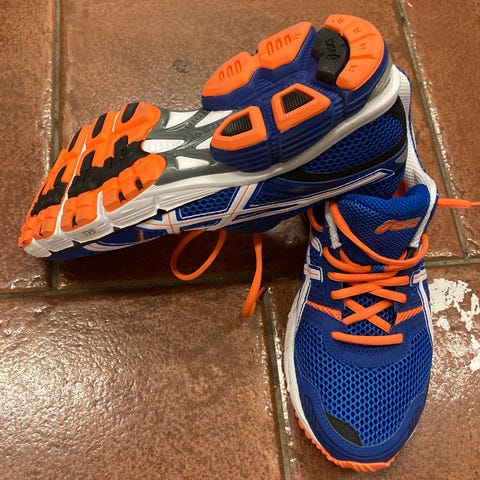 Asics löparskor i storlek 42 med svart ovandel och röd sula. Skorna är designade för löpning och har en ventilerande mesh-yta för bättre komfort under aktivitet.