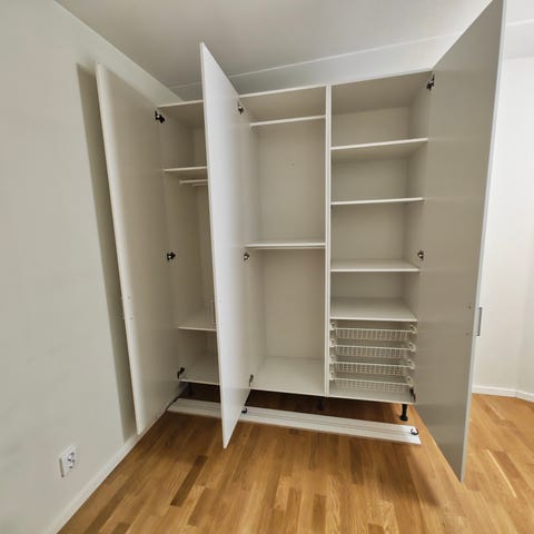 Två vita garderober från Vedum. Överskåpen går att hantera separat. Ingår: