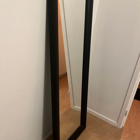 Rund spegel med svart ram. Spegeln är avsedd för väggmontering men kan också ställas mot en vägg och har en enkel, modern design som passar i olika rum.