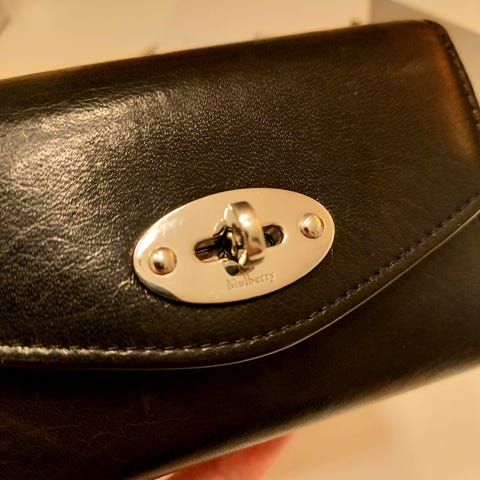 Mulberry plånbok i svart läder med flera fack för kort och sedlar, samt ett blixtlåsfack för mynt. Plånboken har en metallplatta med Mulberry-logotyp på framsidan och är tillverkad i hållbart läder.