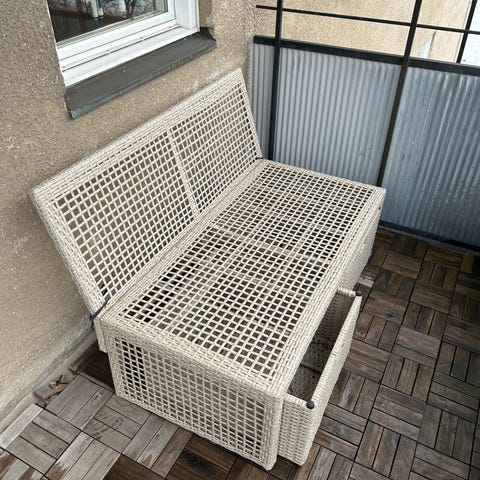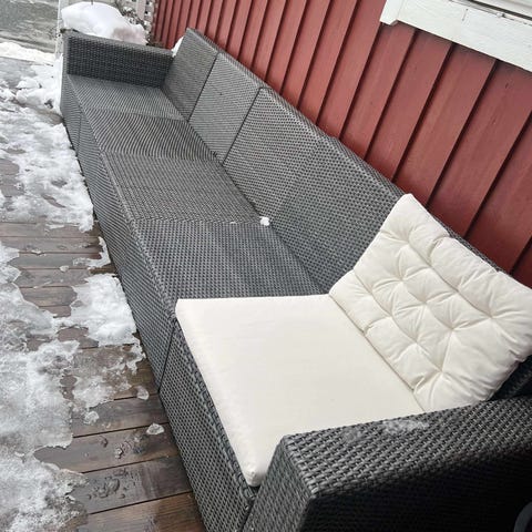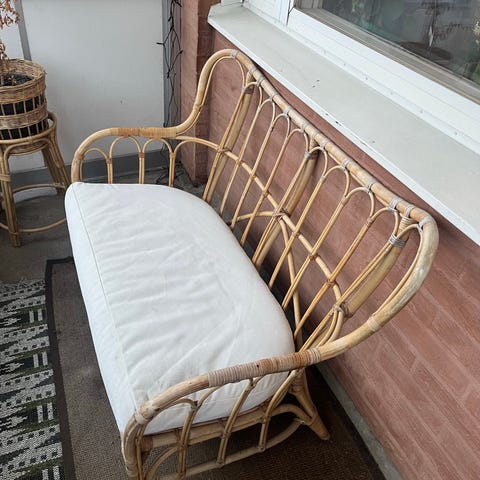 Soffan är 104cm bred. Tyvärr har de stått ute utan att vara täckta över en vinter så är i skick därefter, se bilder. Under ena sitsen på soffan har två rotting"trådar" gått sönder. Se bild. Ingenting som märks när man har dynor på. Dynor ingår ej.