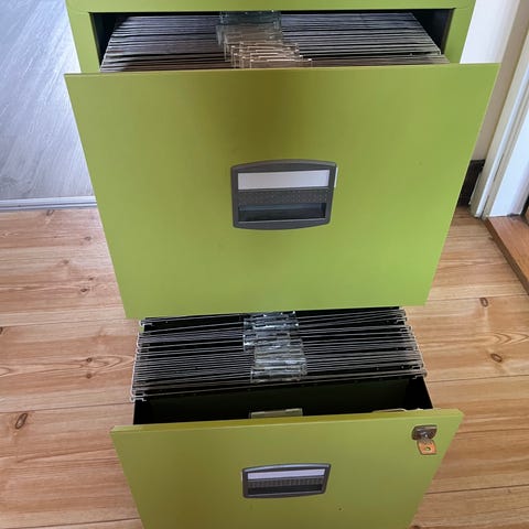 Svart plastlåda utrustad med flera horisontella fack för förvaring och organisering av A4-dokument eller småföremål. Lådan har en kompakt design och är avsedd för användning på skrivbord eller i kontorsmiljö.