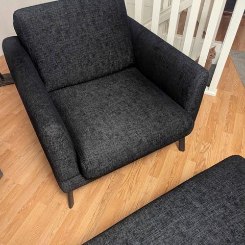 Fåtöljen är jättefin utan några märken eller likande, i nyskick. Suttit i den en handfull gånger så den är knappt använd.