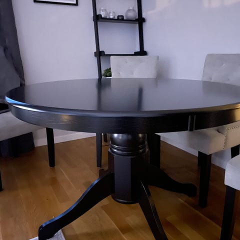Runt matbord med bordskiva i ek med ett svart ben (i mitten) och svart underrede av metall. Nypris var 3200kr.