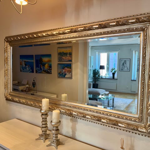 Spegel i Nyskick stor vacker spegel med dekorativ Silverfärgad träram
