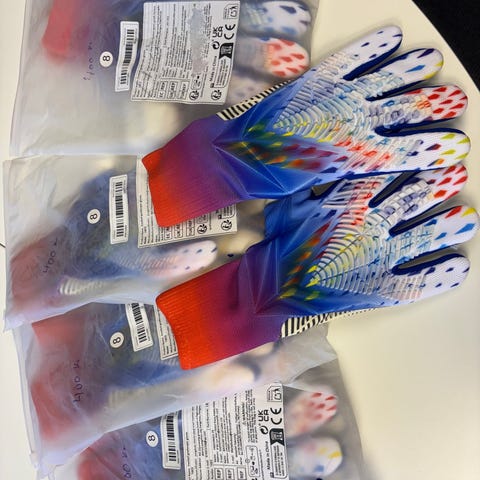 Adidas målvaktshandskar färg svart och vit. Umbro fotbollsskor i svart färg, storlek 45. Handskarna är avsedda för målvaktsspel och skorna är designade för fotbollsspel. Vill man bara köpa handskar är det 100 kr och bara skorna 200 kr handskar använda 5 gånger skorna använda 2 gånger