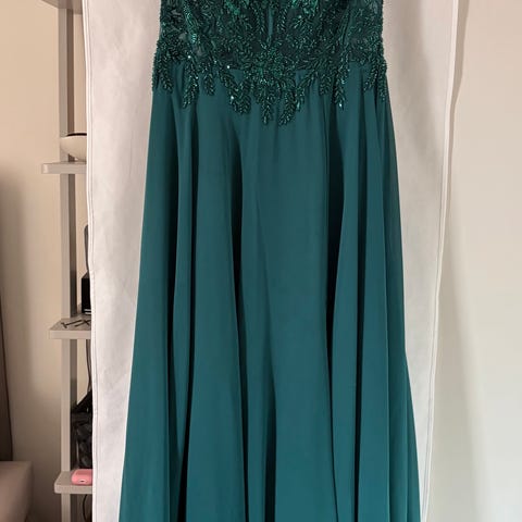 Bal-/Festklänning med fint liv med brodyr och pärlor. Ljusblå med fin lyster. Snörning i ryggen. Fickor och slits. Sparsamt använd, i fint skick.