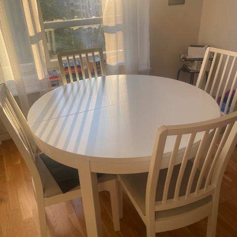 Bordet är begagnat och har en liten ”bubbla” i skivans ena kant, inget som stör funktionen öht, samt en del små skrap på benen efter flytt från förråd….(lätt att måla över/dölja?) perfekt bord för det lite mindre hemmet och verkligen superenkelt att dra ut! (4 sista bilderna är mitt bord)