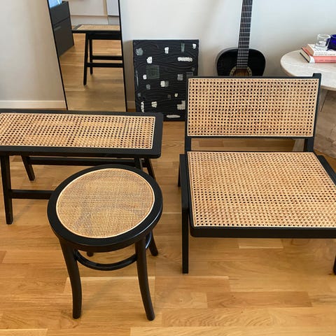 En låg loungestol i merantiträ från H&M Home med sits och ryggstöd i rotting. Några skavanker, men överlag i bra skick.