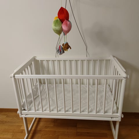 Säljer en bedside crib från Jack & Lily. Sängen är hel, stabil och ren, men det finns viss färgskav (se bild), vilket är rent kosmetiskt och påverkar inte funktionen.