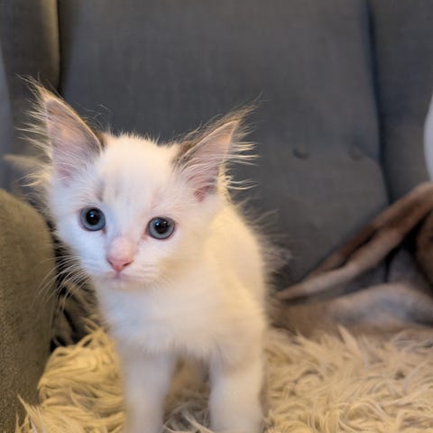 Båda är mycket energifulla och älskar att leka. Den vita är extra oblyg och nyfiken. Samtidigt tycker båda mycket om närhet – de älskar att bli klappade och att mysa i soffan. De är vana vid kloklippning. Kattungarna är inte uppvuxna med barn.
