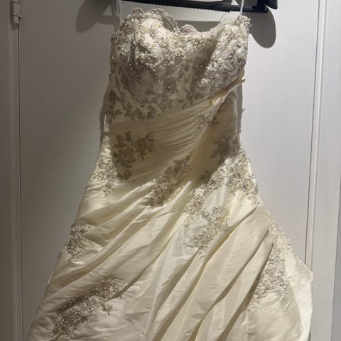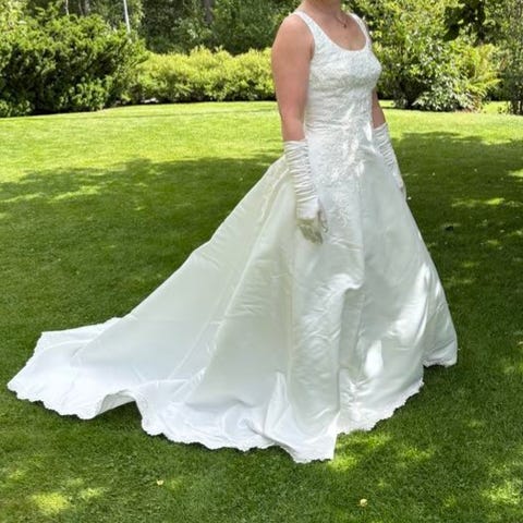 Brudklänning för oss som inte vill ha spets. Storlek 16, motsvarar nog s/m. Köpt i brudbutik på Limhamn. Den är lite kortad för att bli lagom till mig som är 159 cm lång. Åren i garderoben har skrynklat den, och även om den inte har några fläckar så hade en kemtvätt inte skadat för att fräscha till den.
