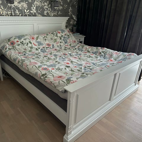 Sängram, sänggavel och ribbotten till salu. Komplett och nedplockad, redo för att hämta. Om man vill kan passade madrasser följa med på köpet.