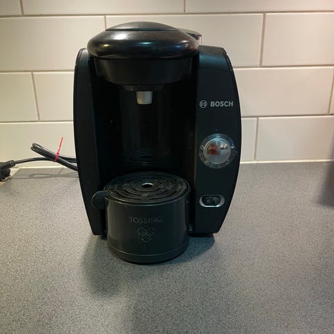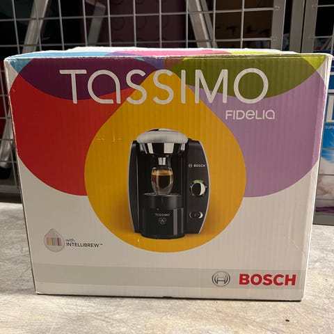 Bosch Tassimo kaffemaskin i svart färg. Maskinen är utformad för att brygga kaffe med Tassimo kapslar och har en kompakt design som passar i de flesta kök. Utrustad med avtagbar vattenbehållare och droppbricka för enkel rengöring.