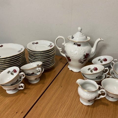 6st x 3 kopp, fat, assiett. 1st tekanna, 1st sockerskål och 1st grädd/mjölkkanna