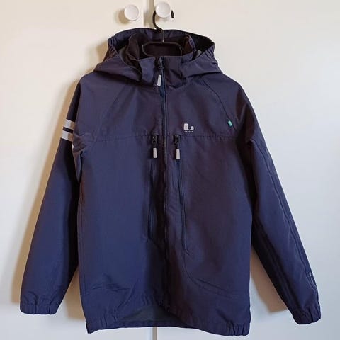 Skaljacka i marinblått från polarn o pyret strl 128, jättefin som ny, använd fåtal gånger. Aldrig tvättad så jackan känns som ny då impregneringen är intakt. Önskas fler bilder skickar jag gärna det.