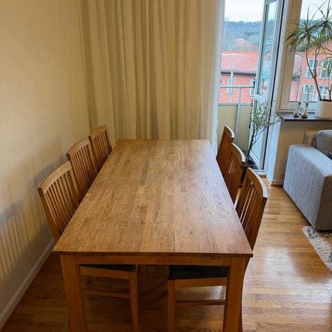 Säljer ett stabilt matbord i massiv ek, mått 90×180 cm, standardhöjd ca 75 cm.