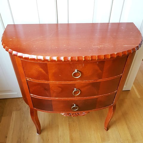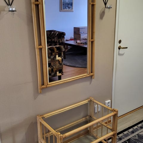 Har används som hallmöbel . Köptes för tre år sedan. Spegeln är 70 x 90 cm