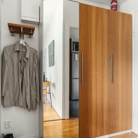 3 PAX wardrobes in these dimensions (https://www.ikea.com/se/sv/p/pax-garderobsstomme-vitlaserad-ekeffekt-00273415/) with doors, drawers and shelves.