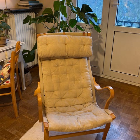 Bruno Mathsson Eva fåtölj MI473 med hög rygg i ett väl använt skick. Linnegjordarna är hela men det finns fläckar. En designklassiker som passar in överallt.