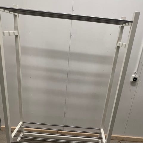 Klädställningen är fristående, stadig och rymmer gott om galgar. Den neutrala designen gör att den passar de flesta inredningsstilar – modern, skandinavisk eller industriell.