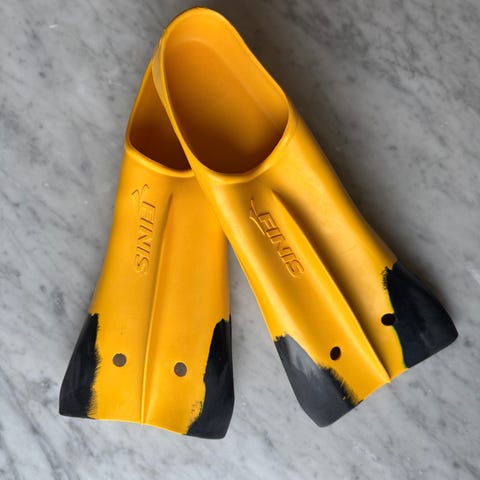 TYR Crossblade simfötter i gul färg, storlek 40-41 samt TYR flytplatta. Tillverkade av material som är lämpliga för simträning och förbättrad fotpositionering under simning.
