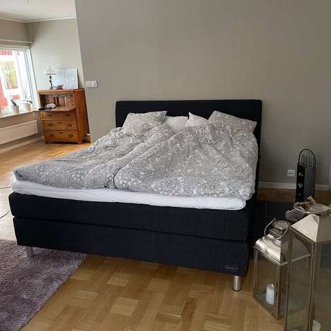 Jensen Diplomat kontintentalsäng i mycket fint skick. Antracitgrå tygklädsel och metallben. Säljes på grund av flytt. Ben i rostfritt stål 10 cm höga. Kvitto finns.