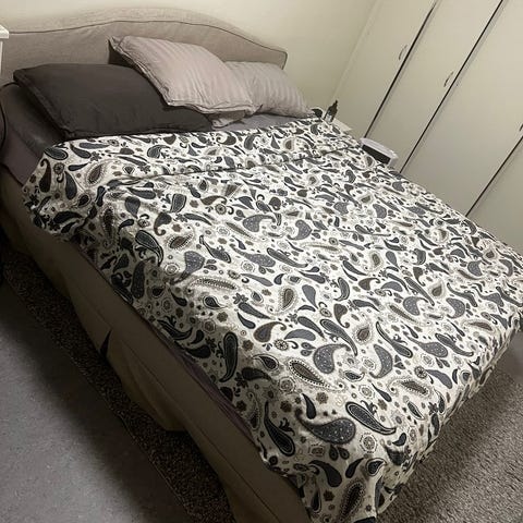 Resårbottenmadrass och bäddmadrass (köpta på Jysk) ingår. Vi har alltid använt madrasskydd.
