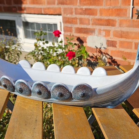 Vackert smärt prydnadsskepp. I överlag gott skick men lite skav finns och ena seglet kräver en omgång med nål och tråd för att kunna fästas i bommen (se bild)