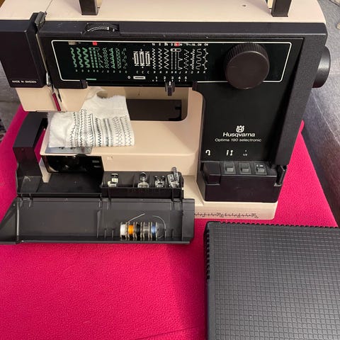 Husqvarna Viking Emerald 116 symaskin med flera stygninställningar och justerbara rattar för sömnad. Maskinen är vit och har en kompakt design med strömbrytare på sidan. Passar för olika sömnadsprojekt och material.ny servad fungerar klockrent med alla tillbehör